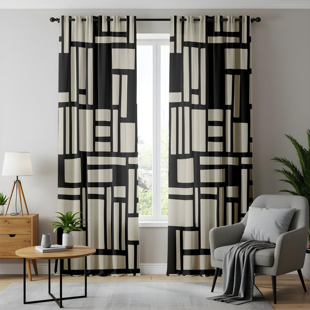 Abstract Geometric Block Curtains – Black and Beige Minimalist Drapes for Modern Interiors