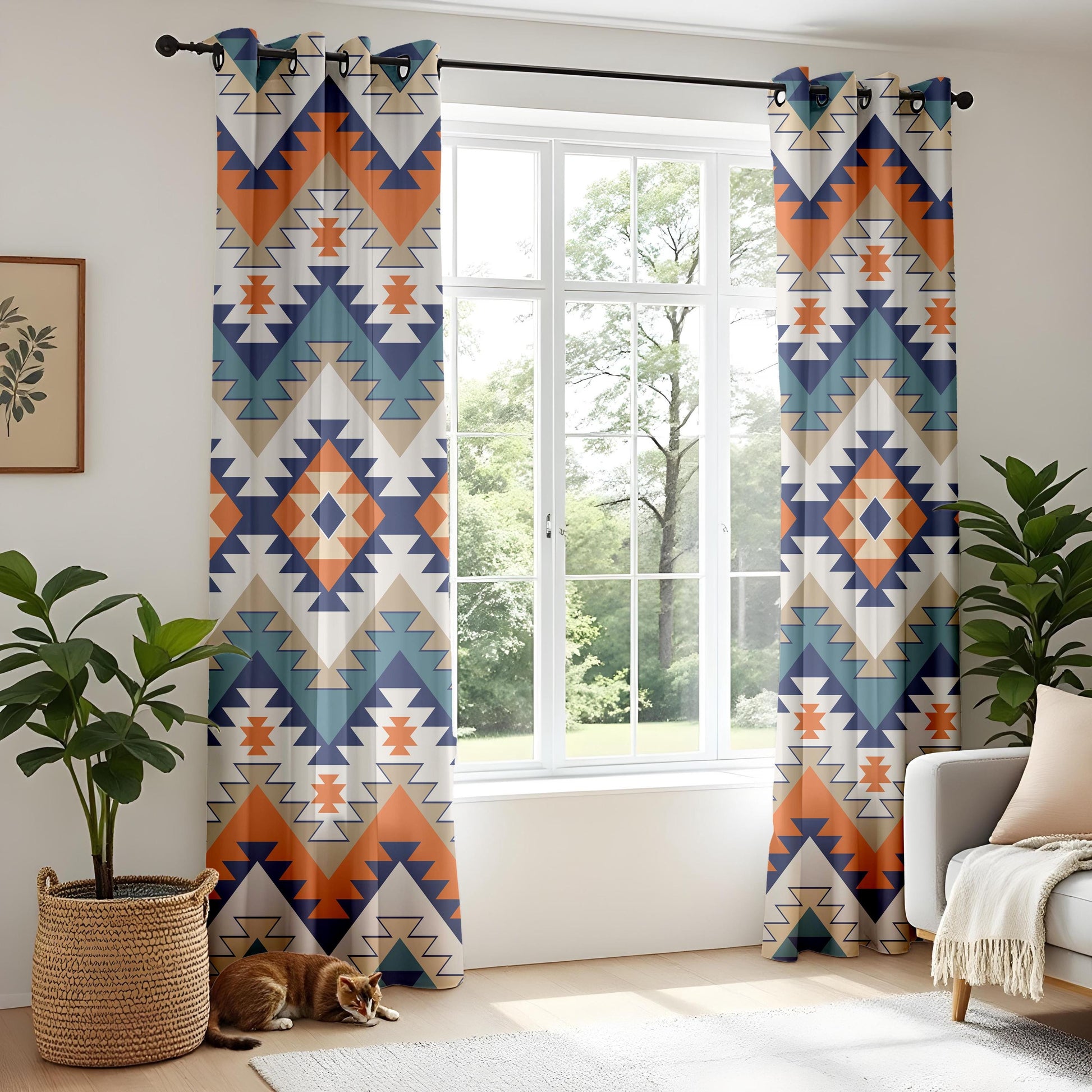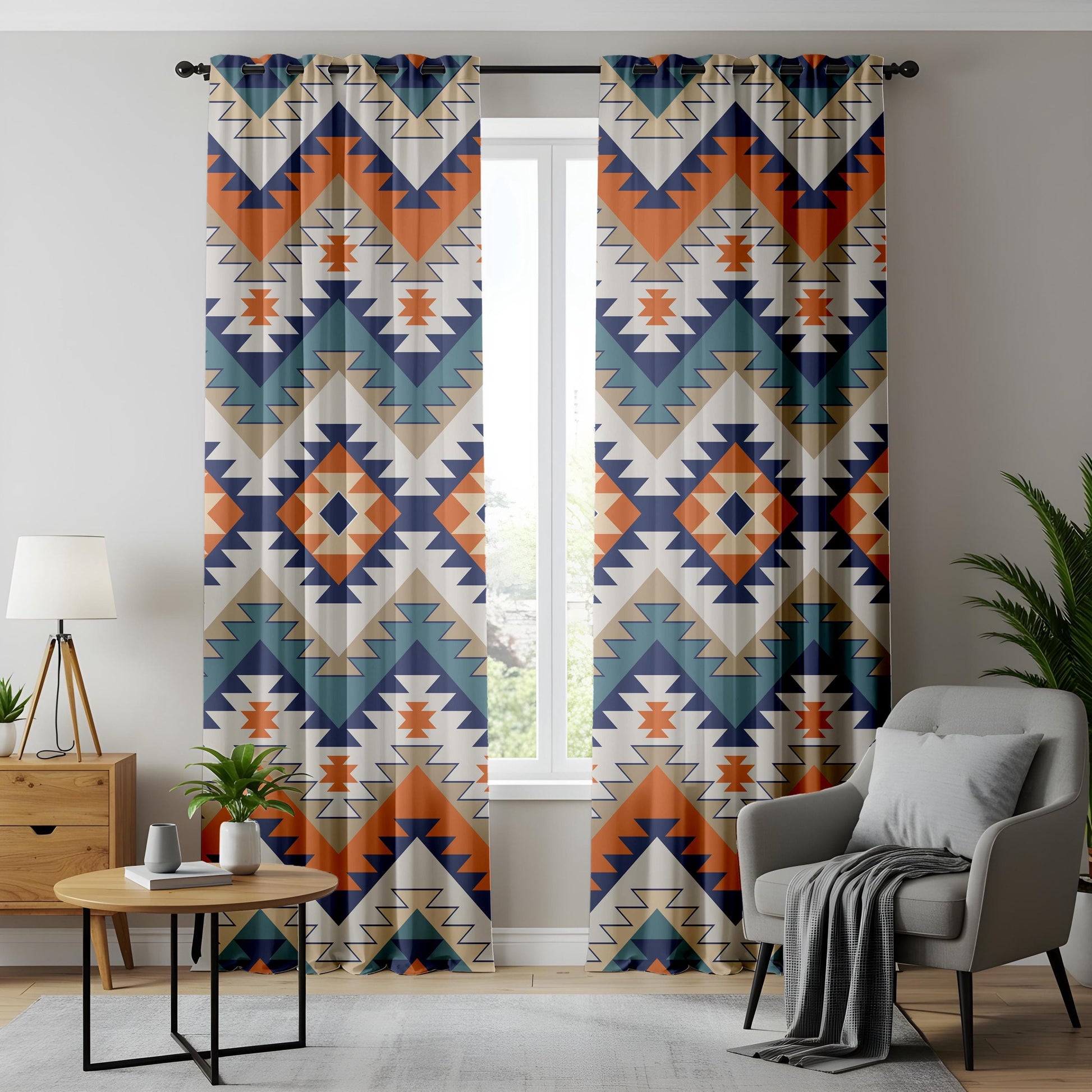 Make a bold style statement with these Aztec Pattern Window Curtains. Featuring vivid hues of orange, blue, and cream in a striking geometric design, these panels bring energy and personality into any room. Inspired by traditional Southwestern motifs, they add a perfect blend of rustic charm and modern flair to your living space.