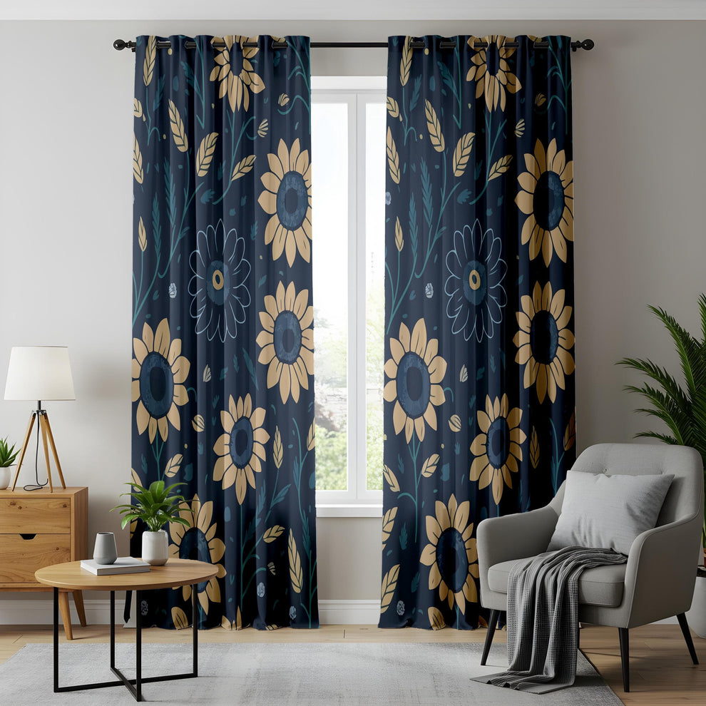 Enhance your space with these Dark Sunflower Curtains, featuring a beautiful blend of navy and golden floral elements. The rich contrast of deep blue and warm gold creates a cozy yet elegant atmosphere, perfect for rustic, farmhouse, or boho-inspired interiors. Whether in the living room, bedroom, or kitchen, these nature-inspired drapes bring warmth and charm to any home decor.