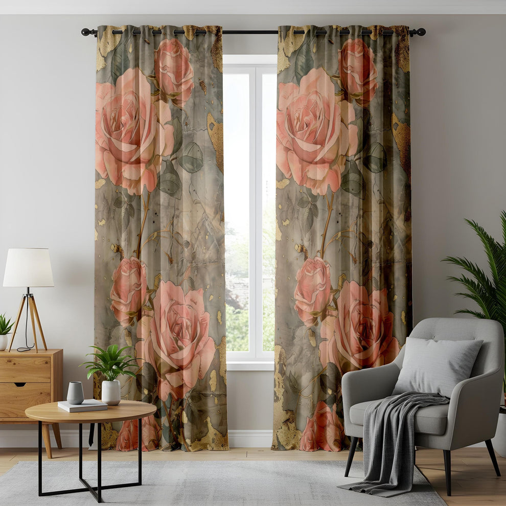 Elegant Pink Rose Curtains or Drapes with Gold Accents