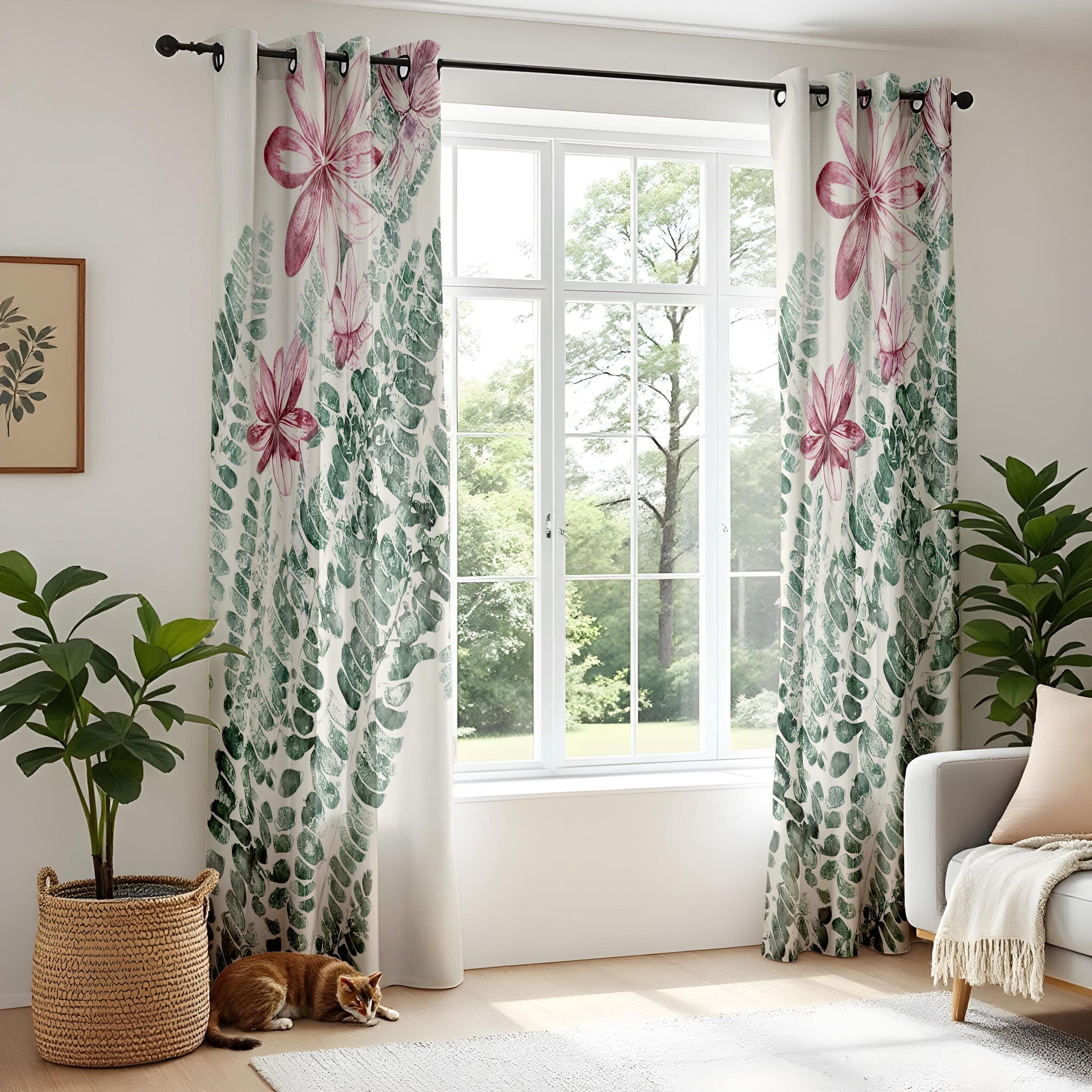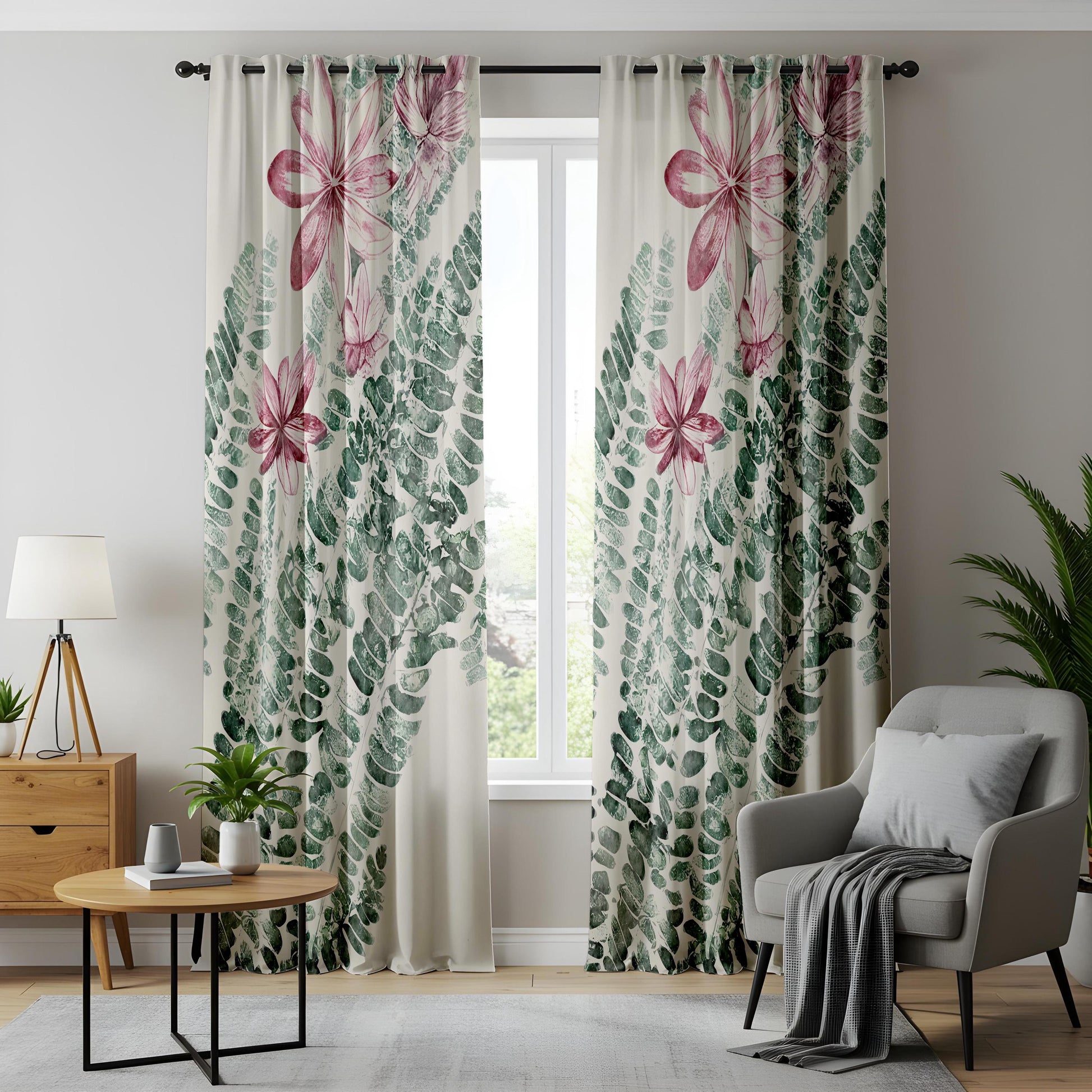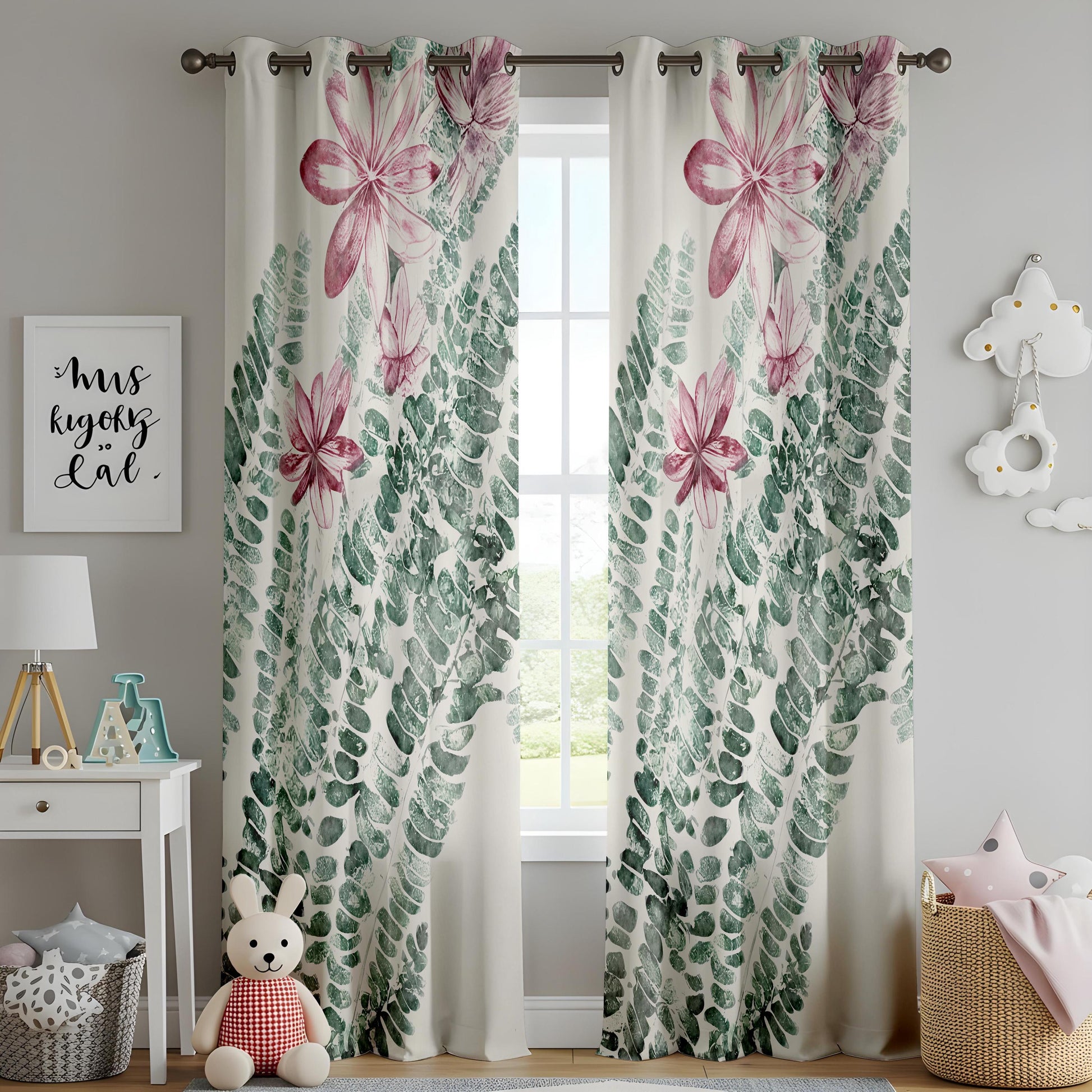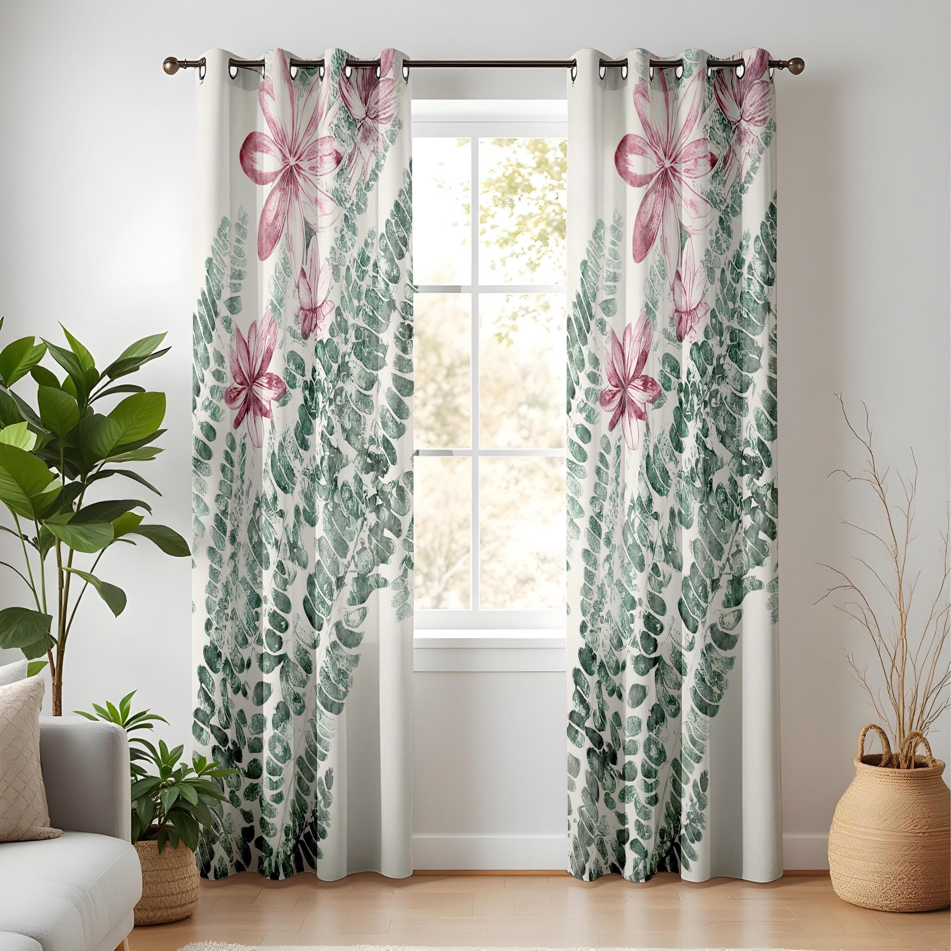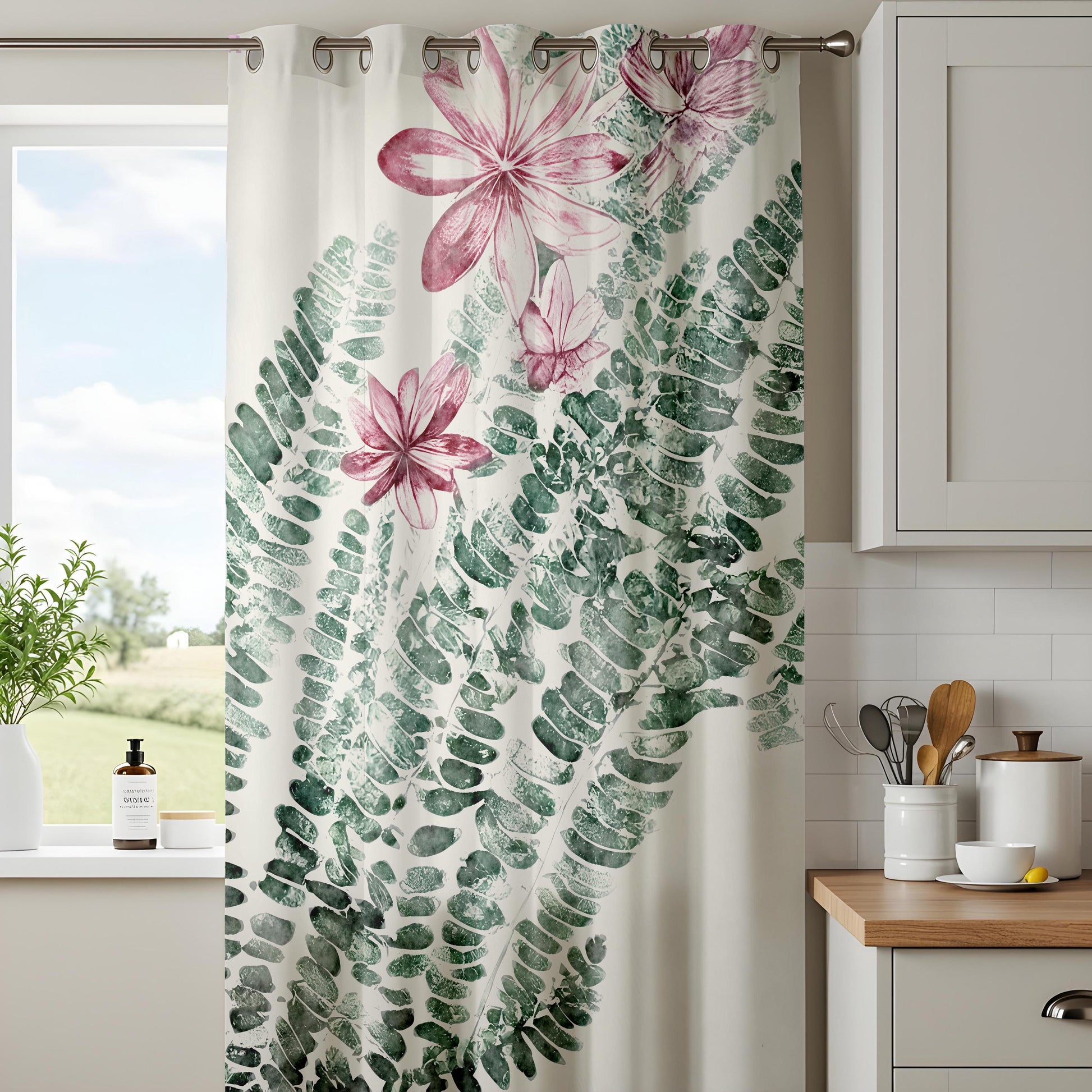 Floral Fern Kitchen Curtains, Pink Blossom Botanical Drapes