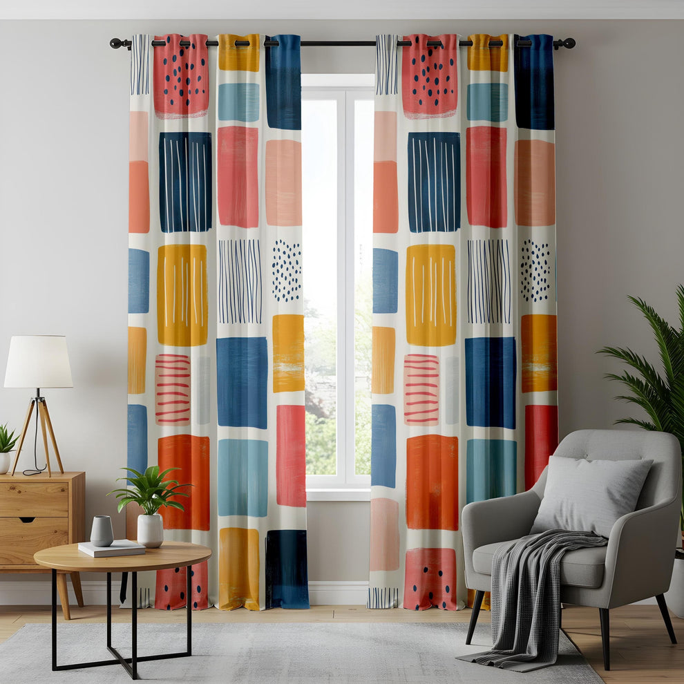 Brighten up your space with these Modern Geometric Curtains, featuring a bold and artistic square print in a stunning mix of warm and cool tones. Inspired by mid-century modern and Scandinavian design, these drapes bring a stylish yet playful touch to any room. The hand-painted look and abstract aesthetic make them a perfect fit for contemporary, boho, or eclectic interiors. Ideal for living rooms, bedrooms, or creative spaces, these curtains add personality and charm to your decor!