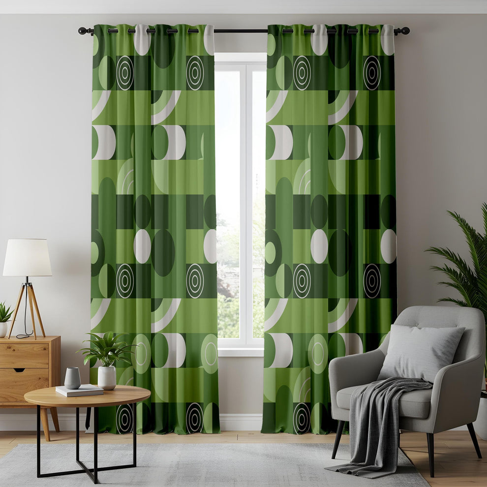 Green Geometric Curtains – Mid-Century Modern Drapes with Retro White Pattern
