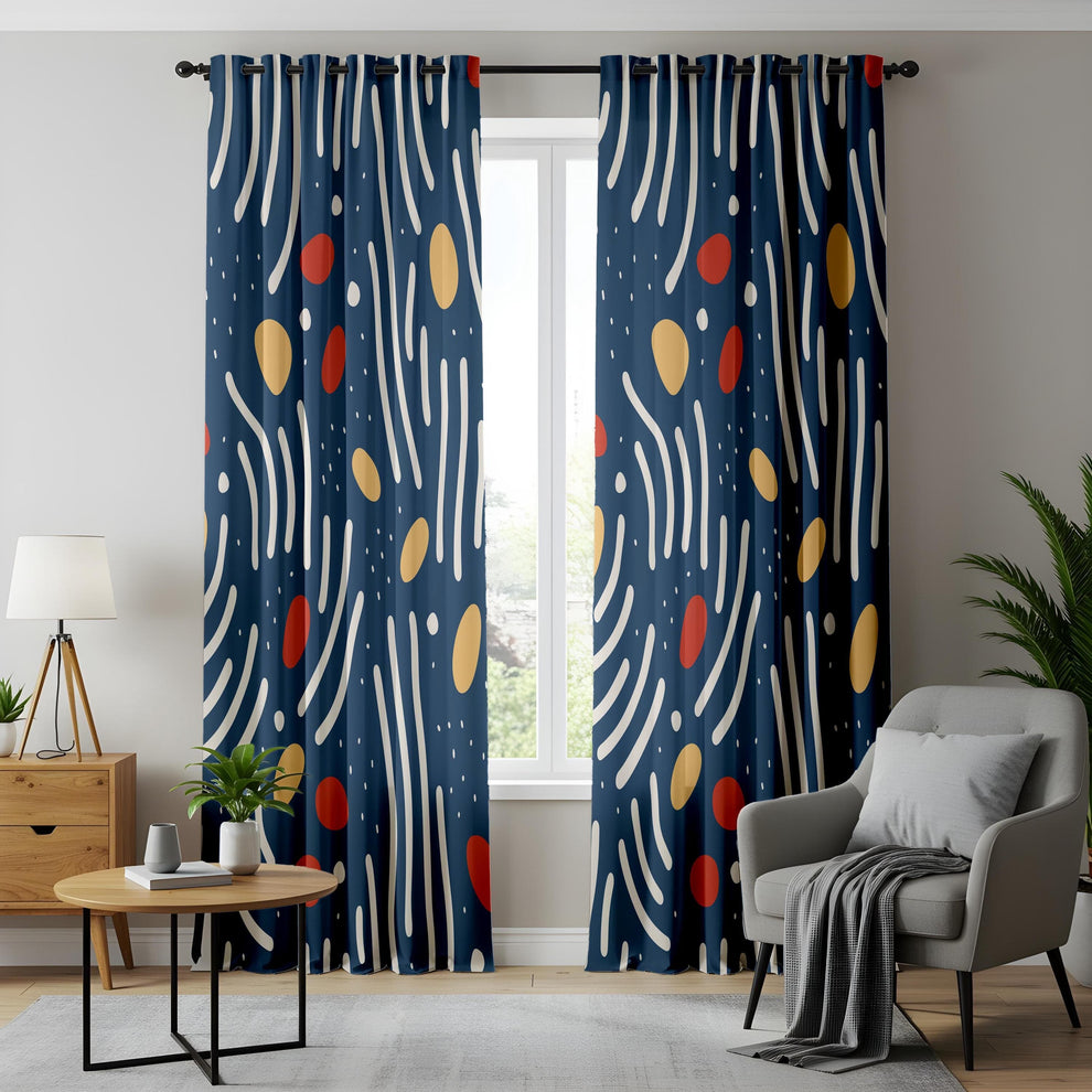 Modern Abstract Blue Curtains – Scandinavian Drapes with Red and Yellow Accents