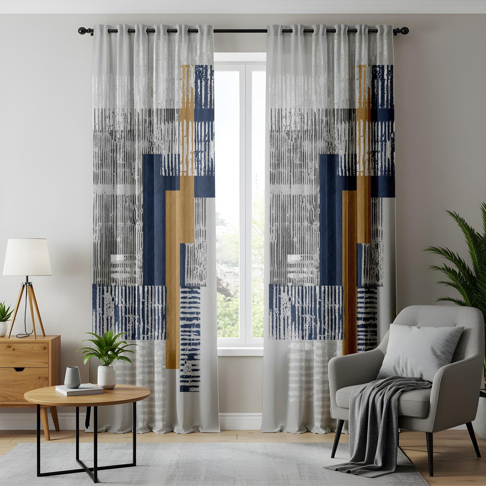 Modern Abstract Geometric Curtains – Blue and Gold Drapes with Textured Artistic Design