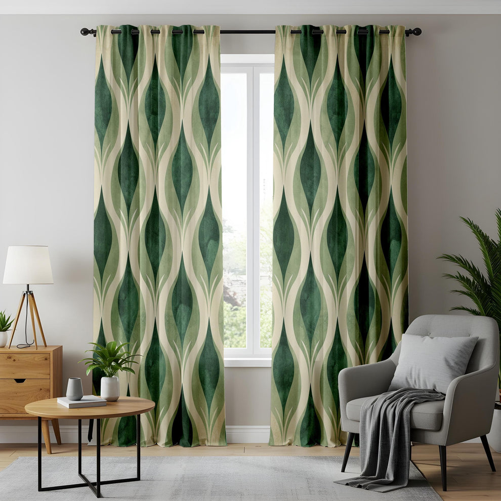 Retro Green Geometric Curtains, Vintage Mid-Century Modern Window Drapes