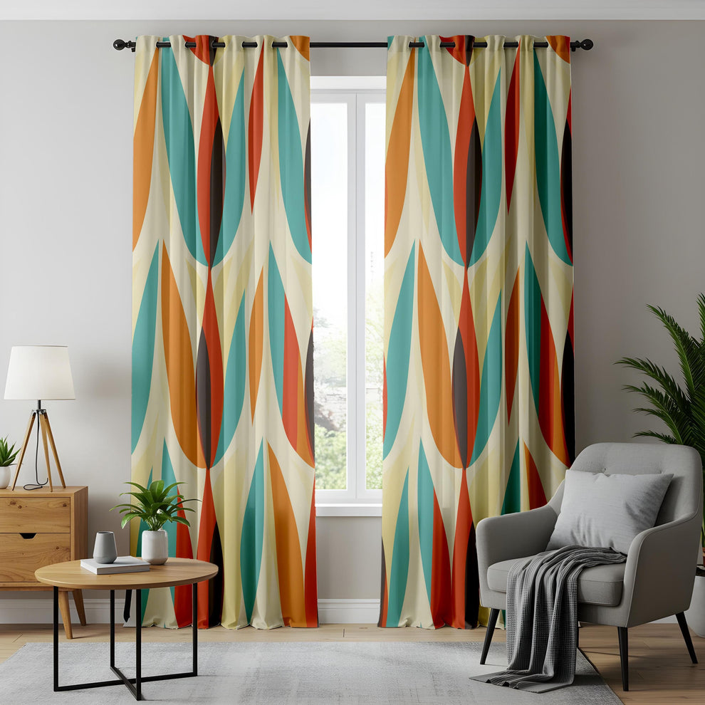 Retro Living Room Curtains, Mid-Century Drapes, Orange and Teal Oval Pattern