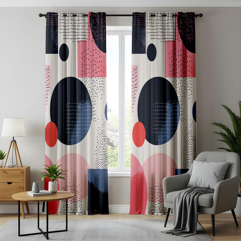 Elevate your living space with these Playful Geometric Circle Living Room Curtains, featuring a striking mix of coral pink, navy blue, and creamy white tones. The bold circular patterns and abstract dotted textures create a vibrant pop art aesthetic, perfect for adding a touch of modern flair to both minimalist and eclectic interiors. These curtains effortlessly blend style and functionality, making them a standout addition to your home decor.