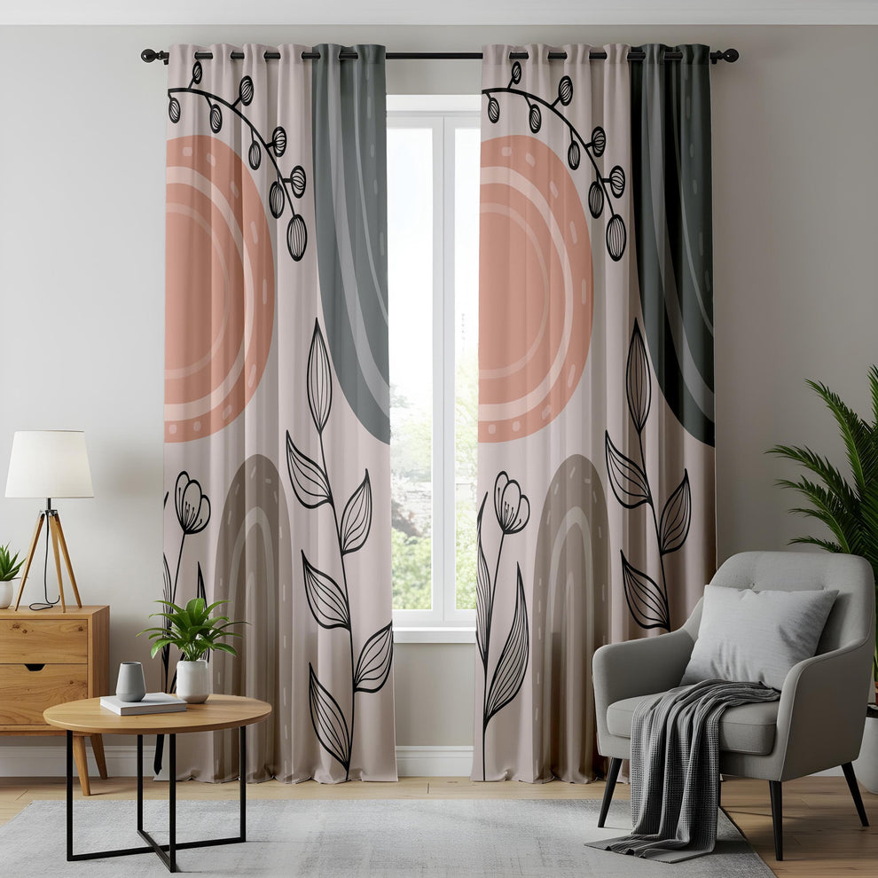 Scandinavian Boho Plant Curtains – Neutral Pastel Drapes with Abstract Floral Line Art