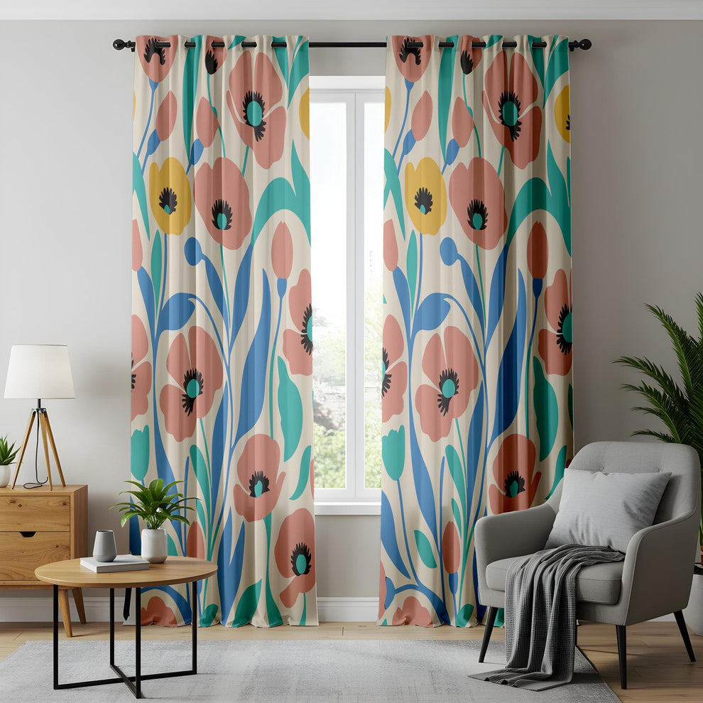 Soft Pastel Floral Curtains, Peach and Teal Flower Design Print Drapes