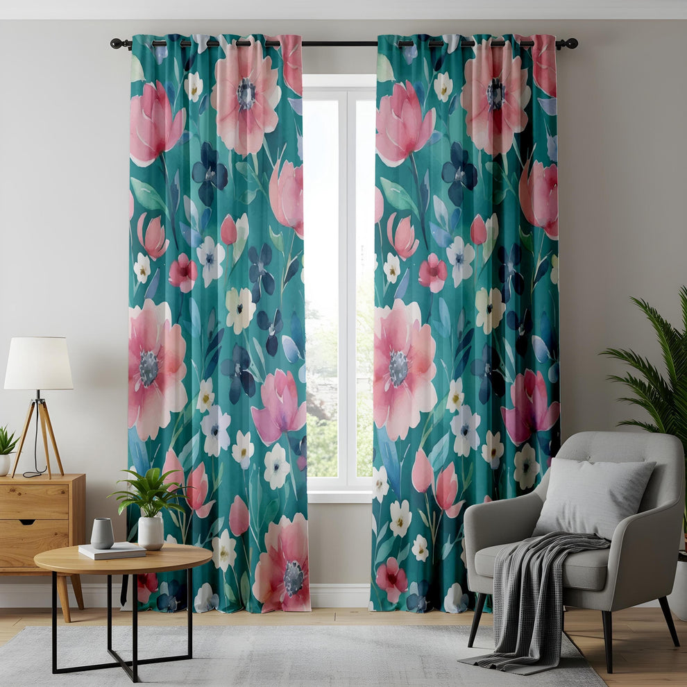 Bring brightness and charm into your living room with these Teal Floral Curtains. Featuring a lush garden of watercolor flowers in pink, navy, and ivory on a vibrant teal backdrop, these panels offer the perfect balance of energy and elegance. A great choice to refresh your space with nature-inspired beauty.
